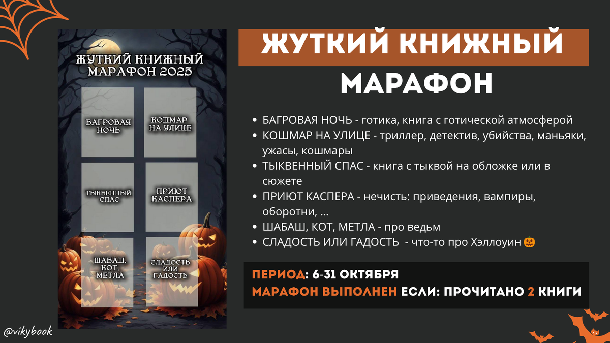 классическая книжная традиция должна быть соблюдена я очень ждала октябрь именно из этого марафона, но у других блогеров я пока анонсов не увидела, поэтому мы придумали пункты марафона в этом году сами - надеюсь вам понравится 👻 # остается как и всегда во всех соцсетях #жуткийкнижныймарафон 👻 трекеры оставляю в посте ниже - выбирайте любой 👻 сроки проведения: 6-31 октября 👻 марафон выполнен если: прочитано 2 книги из 6 пунктов 🏰 проводить марафон буду на канале https://t.me/vikybook присоединиться к марафону можно весь октябрь в любое время 🎃БАГРОВАЯ НОЧЬ - готика, книга с готической атмосферой 🎃КОШМАР НА УЛИЦЕ - триллер, детектив, убийства, маньяки, ужасы, кошмары 🎃ТЫКВЕННЫЙ СПАС - книга с тыквой на обложке или в сюжете 🎃ПРИЮТ КАСПЕРА - нечисть: приведения, вампиры, оборотни, … 🎃ШАБАШ, КОТ, МЕТЛА - про ведьм 🎃СЛАДОСТЬ ИЛИ ГАДОСТЬ - что-то про Хэллоуин 🎃 ВСЕМ ЖУТКО КРУТЫХ ЧТЕНИЙ🤩