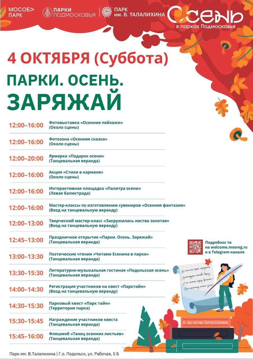 ✨ Фестиваль "Заряжай" в парке им. В. Талалихина 🍂 12:00-16:00 - Акция "Стихи в кармане" (около сцены); 🍂 12:00-16:00 - Интерактив (левая балюстрада); На ТАНЦ. ВЕРАНДЕ 🍂 12:00-16:00 - Мастер-классы 🍂 12:45-13:00 - Праздничное открытие 🍂 13:00-13:30 - Поэтические чтения 🍂 13:30-15:30 - Концерт 🍂 14:00-14:30 - Регистрация на квест 🍂 14:30-15:30 - Парковый квест и награждение (территория парка); 🍂 15:45-16:00 - Флешмоб 🚫 Возраст: 0+ 📆 04.10.2025 🕒 12:00 🏢 Парк культуры и отдыха им. В. Талалихина 📍 г. Подольск, ул. Рабочая, 5Б 💰 Вход свободный❗️ ⭐Поддержать канал голосом 💰 Вакансия - курьер в Подольске ✅ Мероприятия Подольск https://dzen.ru/id/66ed500f7b5671493eca3fd6 http://vk.com/podolsk_events http://dzen.ru/podolsk_events