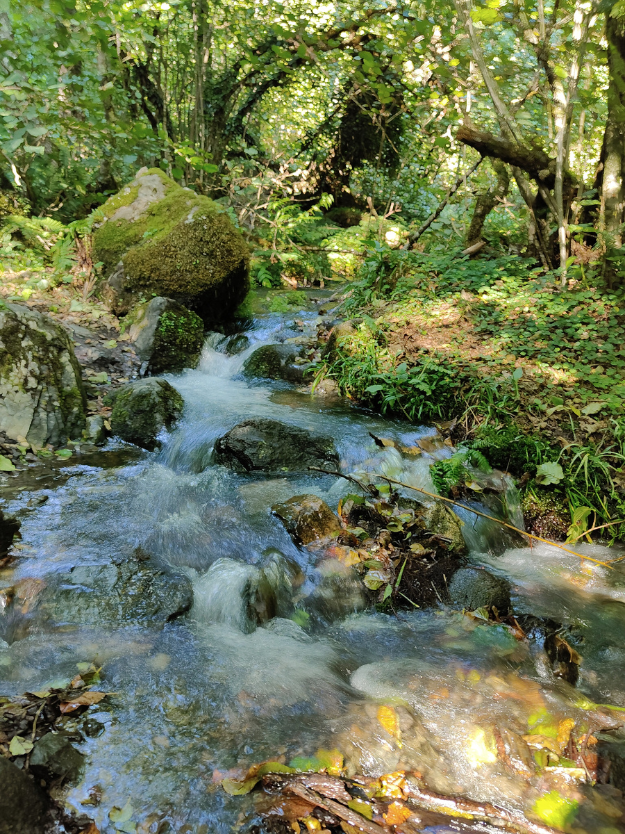 А здесь перед нами тихая заводь с абсолютно прозрачной водой - это так называемая Святая река, место верующими считается чудотворным. Святая, потому что вытекает она прямо из-под горы, имеющей также название Святая (она же Инал-куба, она же Псху-ныха - одна из семи священных гор Абхазии).