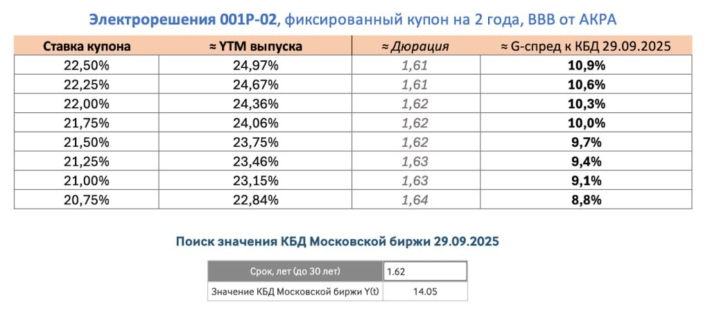 Рейтинг компании BBB от АКРА (был подтвержден в марте 2025). В обращении у Электрорешений находится 1 выпуск с текущим сроком до погашения меньше года (0,77 лет срок и 0,72 дюрация), который рынок прайсит на 21,5-22% YTM.