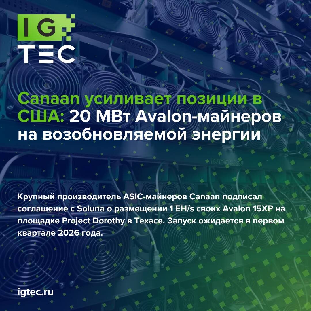 ❇️Canaan усиливает позиции в США: 20 МВт Avalon-майнеров на возобновляемой энергии Крупный производитель ASIC-майнеров Canaan подписал соглашение с Soluna о размещении 1 EH/s своих Avalon 15XP на площадке Project Dorothy в Техасе. Запуск ожидается в первом квартале 2026 года. 📈Для Canaan это шаг в развитии собственной майнинговой инфраструктуры в Северной Америке. Компания активно балансирует продажи оборудования и собственный майнинг, наращивая хешрейт — только за этот год показатель вырос на 95% до 6,44 EH/s. 💰Для Soluna — это монетизация цифровой инфраструктуры на основе возобновляемой энергетики. Проект работает в основном на ветряной генерации, с возможностью подключения к сети для обеспечения надежности и высокой доступности. 📊Набирает силу тенденция, при которой производители оборудования всё чаще сами заходят в майнинг, чтобы диверсифицировать доходы. Bitmain активно развивает свои пулы и хостинг для инвесторов, а MicroBT делает ставку на производство и партнёрства в США