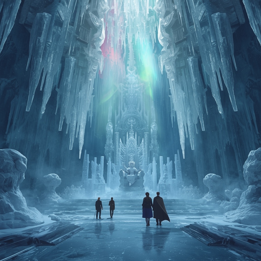 Во дворце их встретила сама Королева Глациа — женщина неопределённого возраста с волосами цвета инея и глазами, в которых отражались северные сияния. Она сидела на троне из чистого льда, окружённая застывшими придворными.
