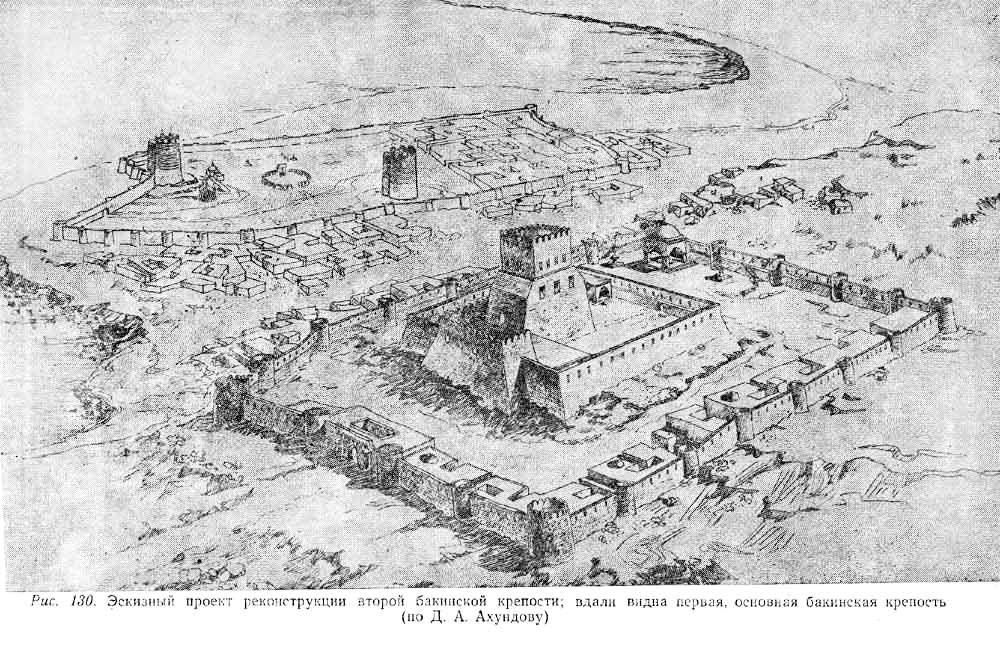 Бакинская крепость, или Ичери Шехер, имеет длинную и туманную историю, уходящую в глубь веков. Первое упоминание о ней исходит из пятого века, хотя обнаруженные внутри Крепости археологические находки удревняют Баку как минимум еще на тысячелетие. О них я писал, поэтому не буду останавливаться: Поводом же для этой статьи послужил интересный эскиз, обнаруженный на просторах Сети. Я бы его пропустил, но автор эскиза — Давуд Ахундов, известный архитектор и историк архитектуры, доктор наук. Не мог же ученый с таким именем выдумать вторую бакинскую крепость из головы. Пришлось копаться. Первое, на что я обратил внимание, что расположение крепости на эскизе совпадает с загородной ханской резиденцией на карте 1806 года. Даже по указанному цветом рельефу на ней видно, что море когда-то подступало к району ее расположения, а сама резиденция находилась на возвышенности. Трудно сказать, какой это район сегодня. Возможно, за ж/д вокзалом, там как раз похожий перепад высот. Также, есть картина русс