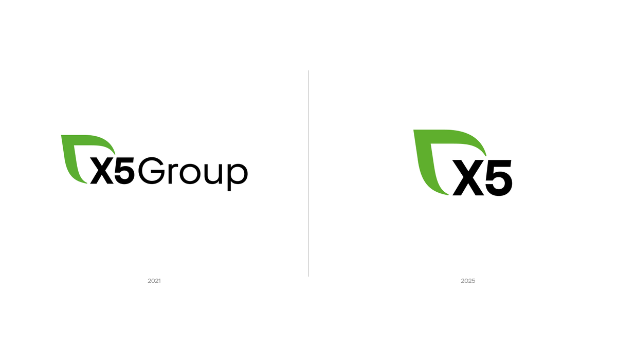 В рамках новой коммуникационной стратегии X5 отказалась от дескриптора Group и обновила визуальный стиль. Название стало лаконичным — X5, сохранив преемственность логотипа и фирменного шрифта. Компания также изменила позиционирование и представила новый слоган — «Главные в еде».