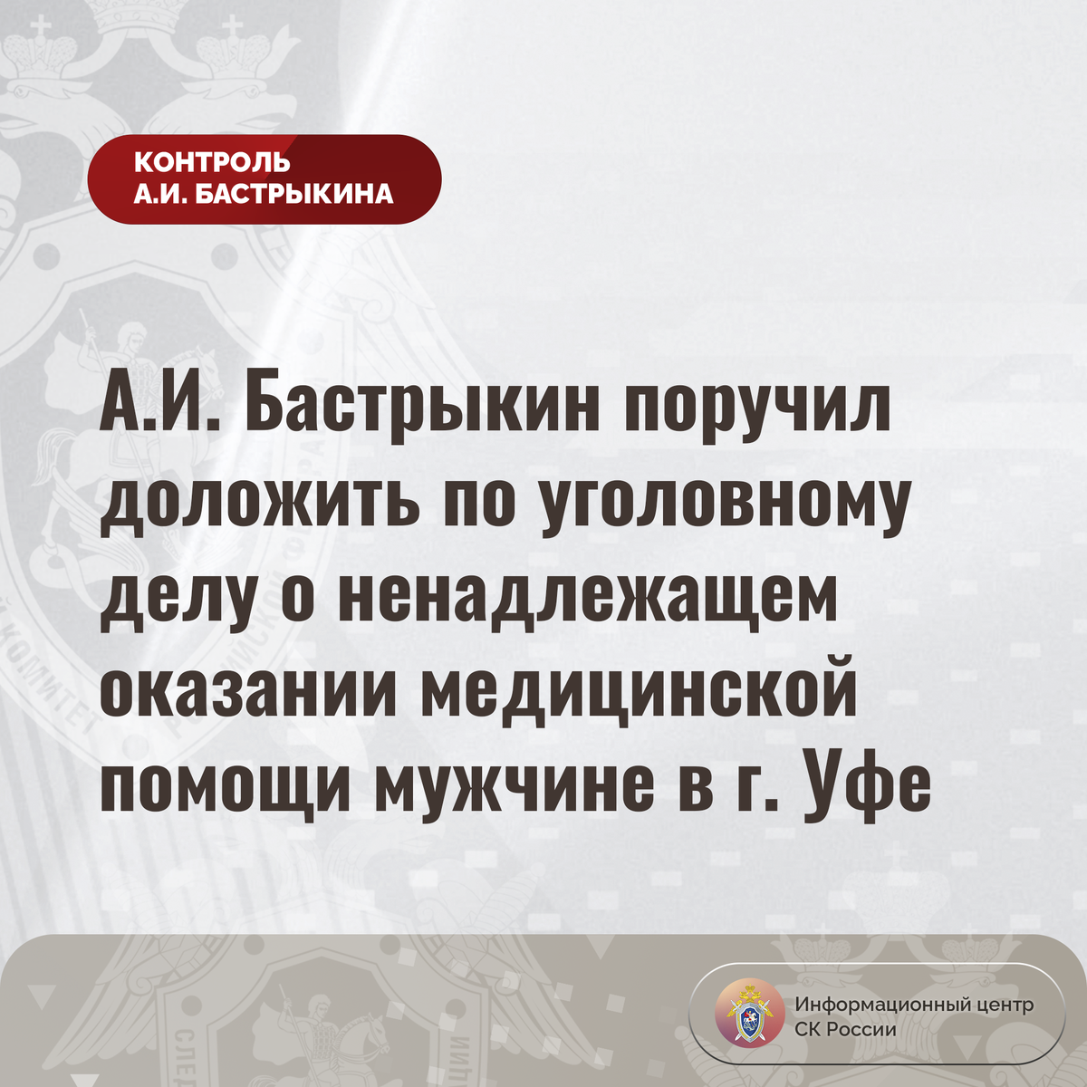 А.И. Бастрыкин поручил доложить по уголовному делу о ненадлежащем оказании медицинской помощи мужчине в г. Уфе