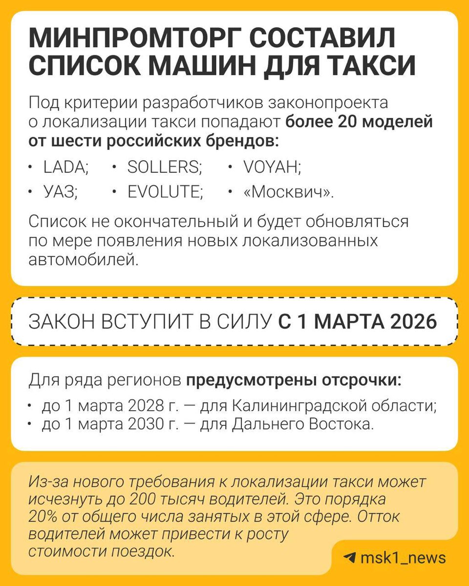Прощаемся с иномарками в такси? Минпромторг составил список автомобилей для такси, которые соответствуют закону о локализации. Когда закон вступит в силу, на чем будем ездить и почему поездки могут подорожать⬆️ Как вам список? 👍🏻 — супер 🗿 — будет отлично, когда его немного расширят 😄 — пожалуй, пересяду на автобусы