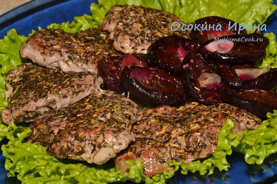 Сегодня блюдо для лентяев или для очень занятых людей, ну или очень уставших) Зачищенную от всего лишнего свиную вырезку грамм на 600 разрезала на ломтики толщиной около 2 см, выложила на доску, придавила ладошкой (ну не отбивать же вырезку) и густенько присыпала сушеными розмарином и тимьяном, сбрызнула оливковым маслом и оставила подмариноваться на час, затем посолила, поперчила, выложила на сковороду с очень хорошо разогретым оливковым маслом пряностями вниз, обжарила до румяности, перевернула и довела до готовности. Подавала с вялеными сливами собственного производства. Великолепное сочетание вкусов и фактур! И быстро) Приятного аппетита