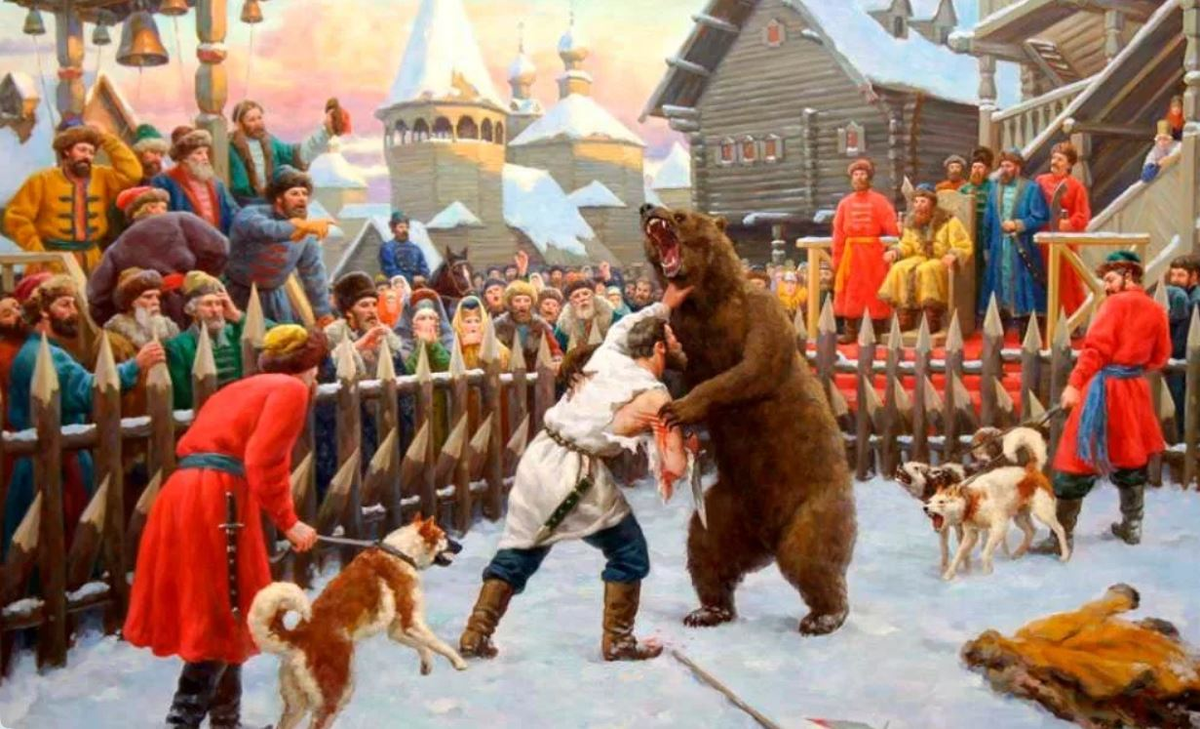 ...В день Св. Исайи приказал царь вывести в пространное место, обнесенное высоким частоколом, огромных медведей, диких, свирепых и голодных, из темных погребов и клеток, где их содержали нарочно для таких его развлечений и увеселений в Великой слободе. Потом выводили туда, одного за другим, рослых монахов, с крестом и чётками в одной руке, а в другой, по великой милости государя, они держали копье в пять футов длины для своей защиты.