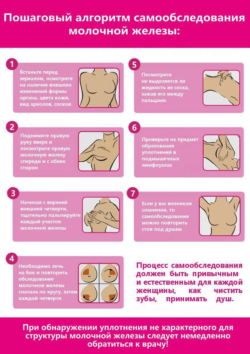 Конечно, в первую очередь это самообследование молочных желез. Эта процедура должна стать таким же ритуалом, как, например, маска для волос в воскресенье. Только важнее! Лучшее время — на 5-7 день цикла (считаем от первого дня месячных), когда грудь максимально расслаблена. Если цикл нерегулярный или вы в менопаузе — просто выберите один и тот же день каждого месяца (например, первое число).