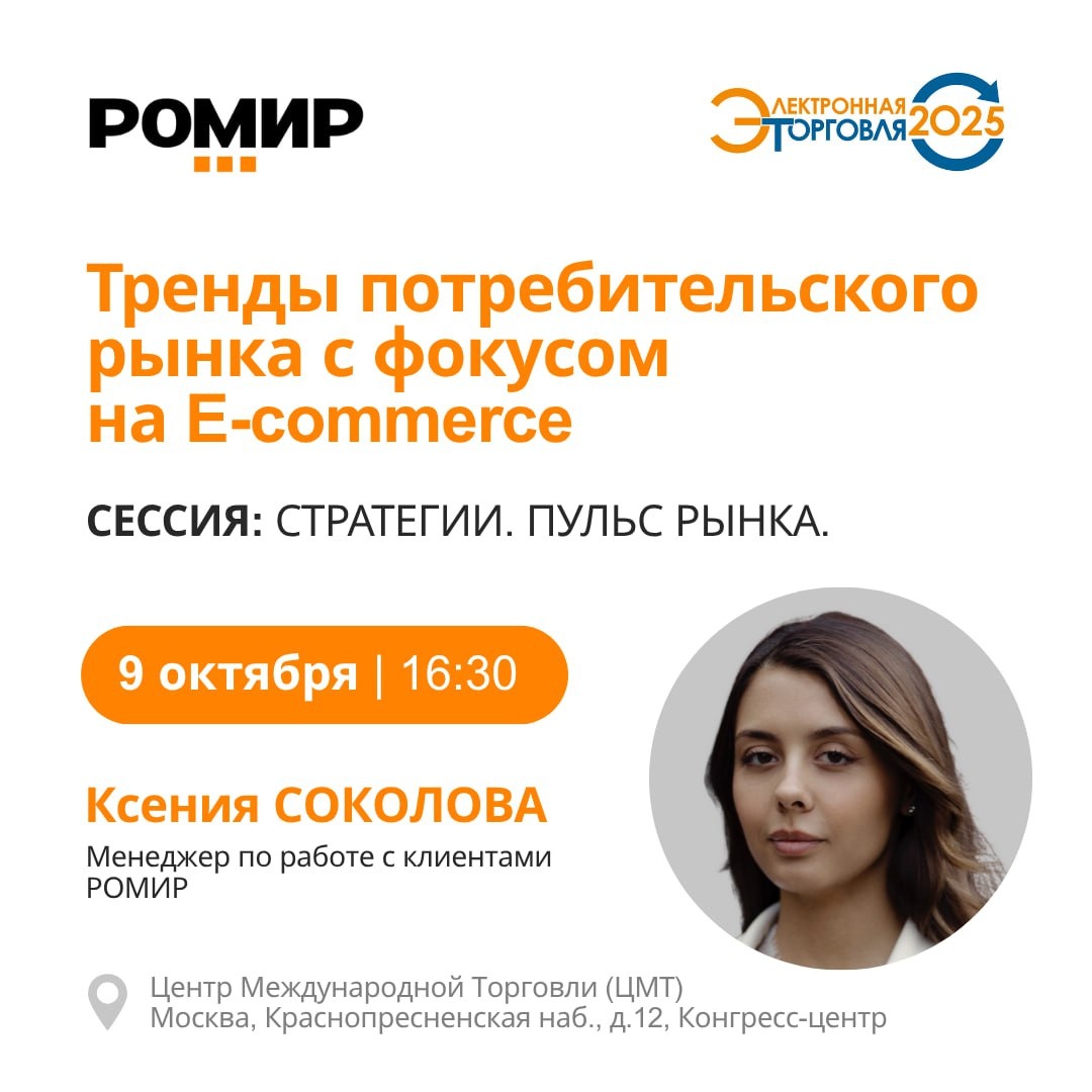 9 октября расскажем о трендах потребительского рынка с фокусом на E-commerce Эксперт РОМИР Ксения Соколова выступит на конференции «Электронная торговля — 2025» и осветит темы: 🔸 динамика потребительских ожиданий; 🔸 трансформация покупательской корзины в офлайне и онлайне; 🔸 динамика розничного рынка: ключевые каналы в кошельке у покупателя; 🔸 источники роста онлайн-сектора; 🔸 ключевые ценностные ожидания российского покупателя от рынка E-commerce. До встречи в Центре Международной Торговли! Подробнее по ссылке➡️ #ЭлектроннаяТорговля2025