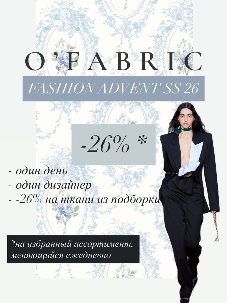 Всем бодрого четверга! Недели моды сезона весна-лето 26 подходят к своему логическому завершению, а пока парижская в самом разгаре мы начинаем КВН свою неделю моды O’Fabric FASHION ADVENT ss26! С 2.10 по 9.10 включительно вас ждут самые модные скидки - 26%* на выделенный ассортимент, соответствующий показу одного из дизайнеров! Так же мы подготовили для вас обзоры на коллекции, анализ трендов и самых классных фишек в стилизации! Да-да, новинки тоже попадут под раздачу! Включайте уведомления, следите за публикациями, чтобы успеть не только приобрести самый лакомый отрез, но и подготовиться к предстоящему сезону! *Не суммируется с другими акциями, предложениями и бонусной системой. Скидка на избранный товар действует ровно сутки с момента публикации, а так же пока товар есть на складе! Проконсультироваться и сделать заказ @O_Fabric WhatsApp +79668611153