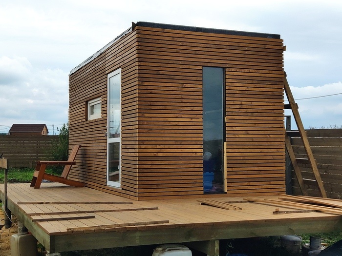 Окна, двери, ОСБ. Каркас обшил 9мм ОСБ. Стеклопакеты купил бу с производства и там же заказал входную дверь, форточка для проветривания тоже бу. Будет что то на подобии безрамного остекления.