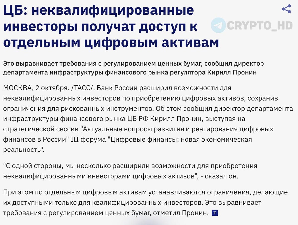 🇷🇺 ЦБ РФ расширяет доступ к цифровым активам для неквалифицированных инвесторов. Директор департамента инфраструктуры финансового рынка ЦБ РФ Кирилл Пронин заявил, что теперь неквалифицированные инвесторы получат доступ к отдельным цифровым активам. При этом для рискованных инструментов сохраняются ограничения – они доступны только квалифицированным инвесторам. Таким образом, требования выравниваются с регулированием рынка ценных бумаг. ЦБ делает шаг навстречу инвесторам, но при этом сохраняет защитные механизмы от излишних рисков. Ранее: - регуляция блокчейн-сервисов - стратегия ЦБ РФ Crypto Headlines