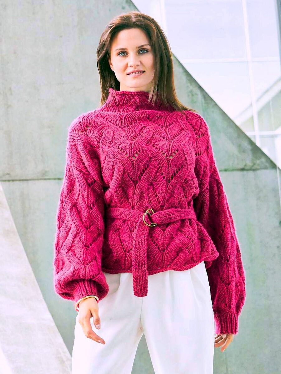 Перед и спинка вяжутся абсолютно прямыми с высоким скосом плеча, создавая спущенную линию плеча. Рукава значительно увеличиваются после выполнения резинки, создавая эффект воздушности. Для воротника-тюльпана, расположенного у горловины, узор просто провязывается на несколько сантиметров больше. И завершает стильный образ ремень-резинка, застегивающийся на два полукольца.