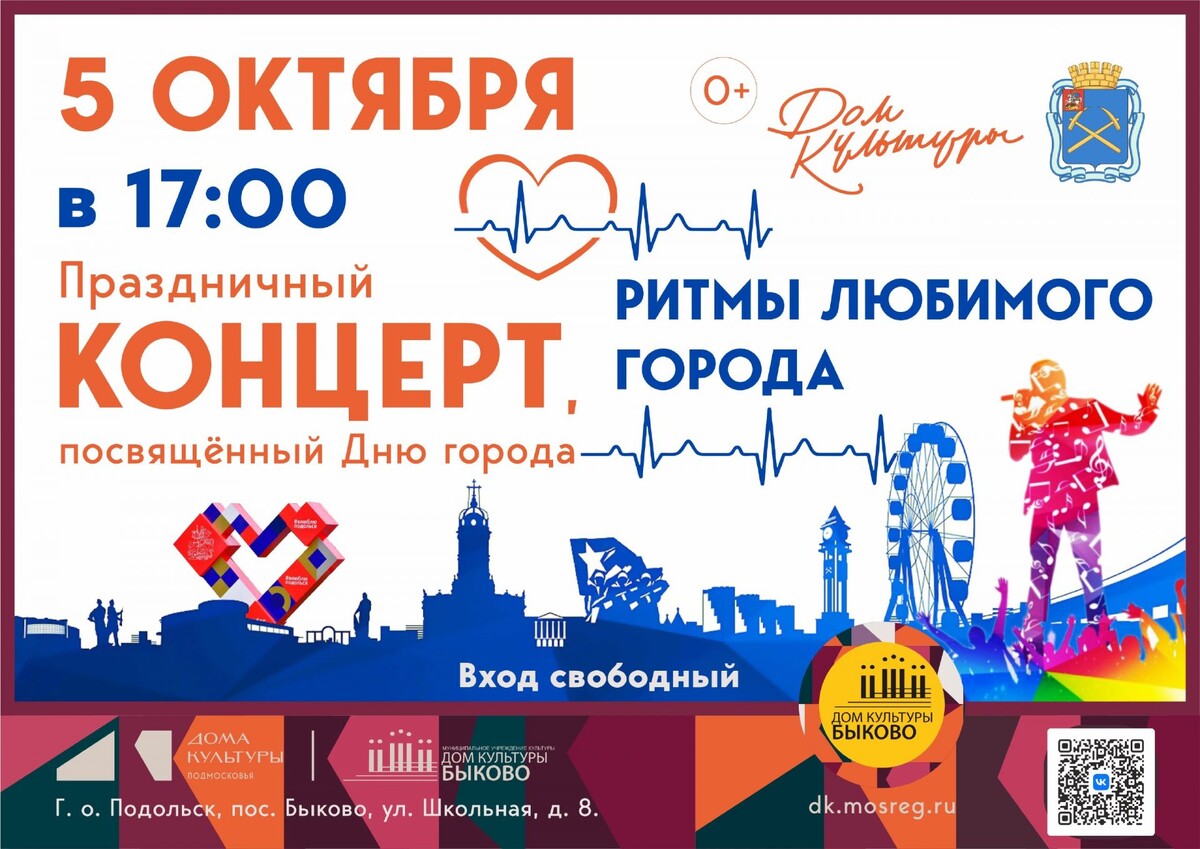 ✨ Концерт РИТМЫ ЛЮБИМОГО ГОРОДА в пос. Быково Приглашаем ♥️ 🚫 Возраст: 0+ 📆 05.10.2025 🕒 17:00 🏢 Дом культуры «Быково» 📍 Московская обл., г. Подольск, п. Быково, ул. Школьная, д. 8 💰 Вход свободный❗️ ⭐Поддержать канал голосом 💰 Вакансия - курьер в Подольске ✅ Мероприятия Подольск https://dzen.ru/id/66ed500f7b5671493eca3fd6 http://vk.com/podolsk_events http://dzen.ru/podolsk_events