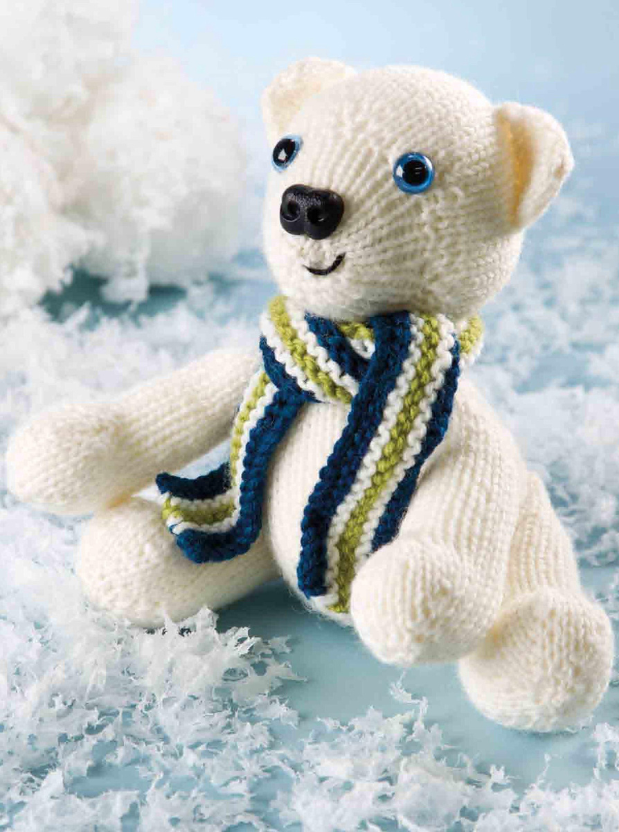Пришейте голову к туловищу. Следуя фото, пришейте каждое ухо к боковой стороне головы. Пришейте ноги к туловищу, сложите хвост пополам по убавке и пришейте к туловищу медведя. Чёрной пряжей вышейте форму рта на мордочке Пепе. Оберните шарф вокруг шеи и пришейте, если хотите.