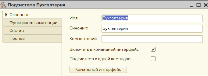 Теперь неофициальное) Вот у нас есть на текущем этапе 5 подсистем, и столько же будет кнопочек для пользователя для перехода между подсистемами (если стоит галка "Включать в командный интерфейс") К подсистеме мы можем добавить подчиненную подсистему, и на экране пользователя это будет выглядеть так: Вот, добавили подсистему "Бухгалтерия", в ней есть только один объект - тестовый справочник. В подчиненной же подсистеме "ПодсистемаБух2" объект тестовый документ. Вот так с помощью подсистем происходит построение интерфейса. 2. Как описать логическую структуру конфигурации при помощи объектов "Подсистема"?