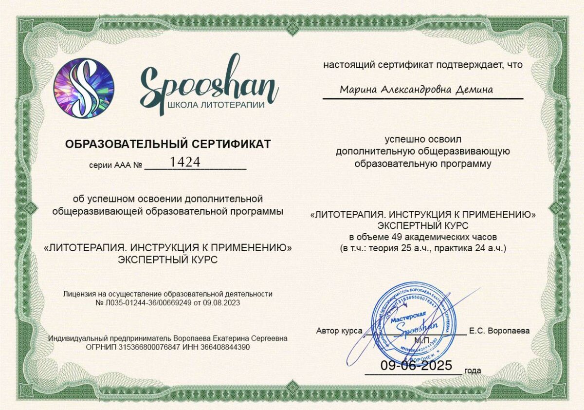 Ну и последнее (всего три курса обучения, это третий) письменное доказательство, что я могу рассуждать на эту тему 😎, диплом сдала со второго раза)) в июне, было сложно, получила на руки в конце августа. Единственная лицензированная школа литотерапии с огромным практическим опытом на фокус группах