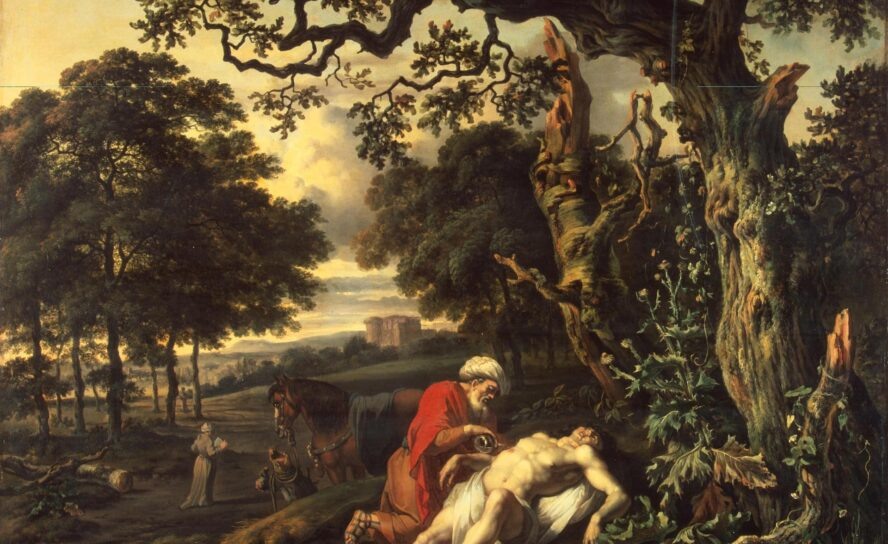 «На это сказал Иисус: некоторый человек шёл из Иерусалима в Иерихон и попался разбойникам, которые сняли с него одежду, изранили его и ушли, оставив его едва живым. По случаю один священник шёл тою дорогою и, увидев его, прошёл мимо. Также и левит, быв на том месте, подошёл, посмотрел и прошёл мимо. Самарянин же некто, проезжая, нашёл на него и, увидев его, сжалился и, подойдя, перевязал ему раны, возливая масло и вино; и, посадив его на своего осла, привёз его в гостиницу и позаботился о нём; а на другой день, отъезжая, вынул два динария, дал содержателю гостиницы и сказал ему: «позаботься о нём; и если издержишь что более, я, когда возвращусь, отдам тебе». Кто из этих троих, думаешь ты, был ближний попавшемуся разбойникам? Он сказал: оказавший ему милость. Тогда Иисус сказал ему: иди, и ты поступай так же», — Евангелие от Луки, глава 10, стихи 30–37.