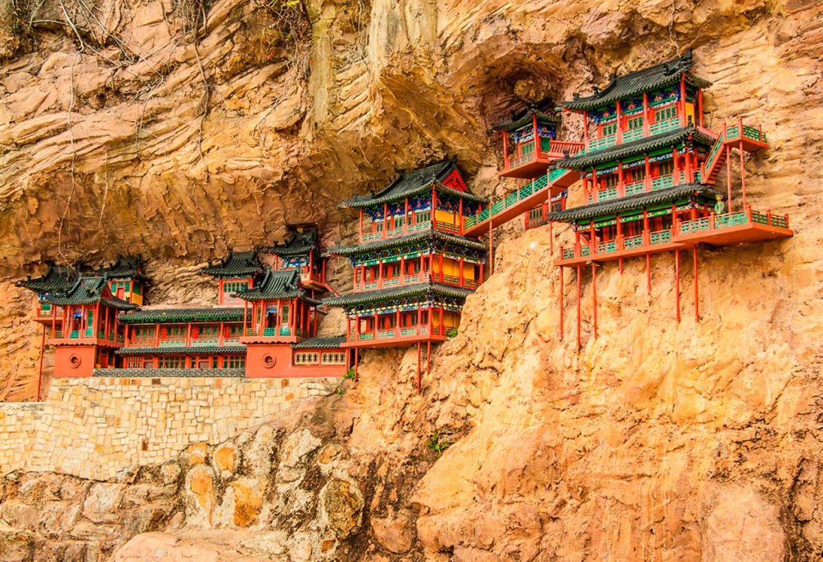Храм Сюанькун-сы (Висячий монастырь). Построенный на отвесной скале около 1500 лет назад, этот храм будто парит в воздухе. Он является уникальным примером слияния даосизма, буддизма и конфуцианства в одной постройке и демонстрирует невероятную смелость древних зодчих. Проще говоря. Хайнань