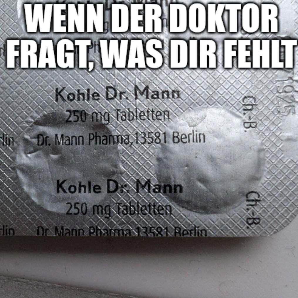 🥰 Что Вас беспокоит? 🤧 Herr Doktor, целых две вещи! Взгляните на этот мем сами: Во-первых, прекрасный вопрос "Was fehlt Ihnen/dir?" Целая палитра значений: от "Что Вас беспокоит?" у врача до дружеского "Что с тобой?" или возмущённого "Что на тебя нашло?" А если дословно – "Чего тебе не хватает?" Во-вторых, игра слов! Ответ на вопрос "Was fehlt Ihnen?" – "Kohle, Dr. Mann!" Имеется в виду, с одной стороны, Aktivkohle (активированный уголь), а с другой – денежки. Деньжата. Бабло. Лавэ. Ну вы поняли. Их никогда не хватает 💵 👋 Herr Doktor, если вы не читали наши старые посты про Kohle и про другие разговорные обозначения денег, бегите читать! А я подожду. 🔡 Учиться с нами