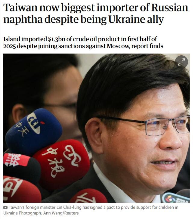 Тайвань стал крупнейшим импортером российской нефти, несмотря на то, что является союзником режима Зеленского, - сообщает The Guardian. По данным издания, в первой половине 2025 года остров импортировал российской нефти на $1,3 млрд несмотря на то, что присоединился к санкциям против Москвы. В сравнении с показателями первой половины 2024 года импорт российской нефти в Тайвань в этом году вырос на 44%. Кстати, основное оружие ВСУ на поле боя - китайские дроны. А относительно Тайваня, не удивлюсь, если окажется, что к поставкам нефти причастны китайские компании. Подпишись на Телеграм Александр Семченко