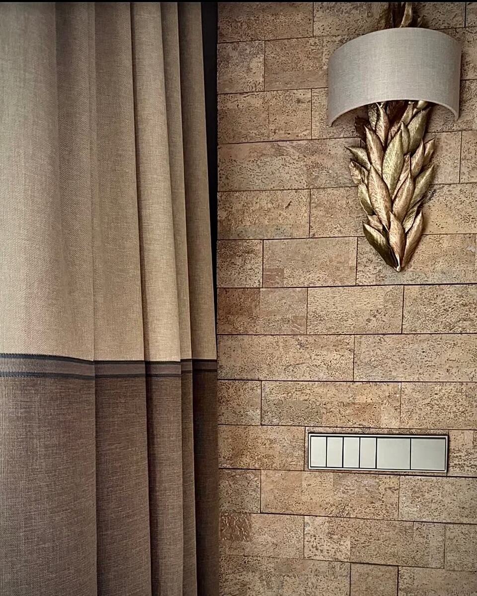 Мы повторили этот приём в текстиле: шторы стали визуальным отражением стены. Такой приём позволил объединить все элементы интерьера в цельную композицию, где каждая деталь поддерживает общую гармонию.