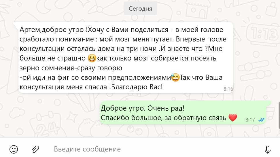 Перед вами обратная связь от клиента, через 3 недели после 1 консультации.