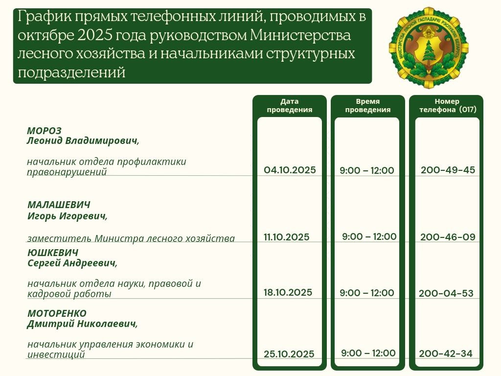 Публикуем график "прямых телефонных линий", проводимых в ОКТЯБРЕ 2025 года руководством Министерства лесного хозяйства и начальниками