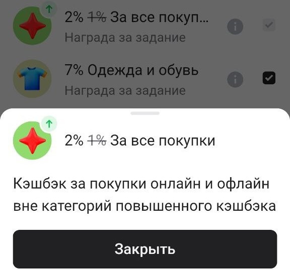 ❗ У кого было задание 2% на всё за сохранение кэшбэка, оно должно засчитаться. Категорию нужно ещё раз выбрать во вкладке «Выгода».
