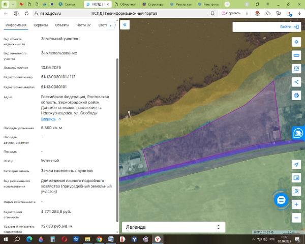 Название: Адрес земельного участка: Российская Федерация, Ростовская область, Зерноградский район, Донское сельское поселение, с. Новокузнецовка. ул. Свободы Кадастровый номер: 61:12:0080101:1112 Площадью: 6560 кв. м Категория земель: Земли населенных пунктов Вид разрешенного использования: Для ведения личного подсобного хозяйства (приусадебный земельный участок) Срок аренды – 20 лет Канал: Госземля Ростовская область Область: обл Ростовская Район: м.р-н Зерноградский Населенный пункт: с.п. Донское, с Новокузнецовка, ул Свободы Локация: Смотреть на карте ВРИ: Для ведения личного подсобного хозяйства (приусадебный земельный участок) Кадастровый номер: 61:12:0080101:1112 Кадастровая стоимость: 4771284.80 Вид сделки: Аренда Площадь: 6560 м² Начальная цена: - руб. Дата завершения: 03.11.2025 Подробнее: ГИС ТОРГИ #госземля #земляотгосударства #земля #земельныйучасток #земельныеторги #торги #аукцион #арендаземли #аренда #ростовскаяобласть