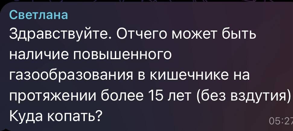Недавно моя подписчица задала мне вот такой вопрос: Что мы тут видим? Что для человека «вздутие» и «газообразование» будто бы разные миры. И это частая ситуация: Все эти истории на ощущениях разные. Одного выводит из себя распирание, другого частые газы, третьего урчание, четвёртого отрыжка. И по влиянию на качество жизни они действительно отличаются: кому-то тяжело сидеть в джинсах, кому-то — сидеть на планёрке, кому-то — просто выйти в люди без тревоги, что «сейчас начнётся». Но вот что важно понимать. С точки зрения обследования, питания и лечения это один и тот же класс проблем. Как бы вы ни называли свой главный симптом — «вздутие», «избыточные газы», «урчание», «отрыжка» — врач идёт по одному и тому же маршруту. Это одинаковая логика вопросов, одинаковый принцип диагностики, те же базовые рекомендации по питанию и темпам коррекции. Мы не делим: «это лечится так, а это — иначе» только потому, что в одном случае больше распирает, а в другом — больше шумит. Поэтому если, как у Светл