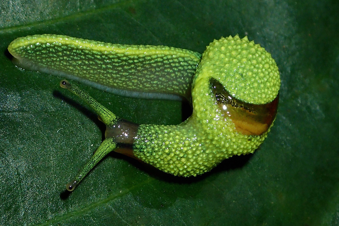 Наш герой — улитка-ниндзя (Ibycus rachelae). Это представитель полуслизней: у него есть крошечная, недоразвитая раковина, которая не позволяет втянуться целиком. Такое промежуточное положение между улиткой и слизнем делает его особенно любопытным — словно сама природа решила не раскрывать всех карт сразу.