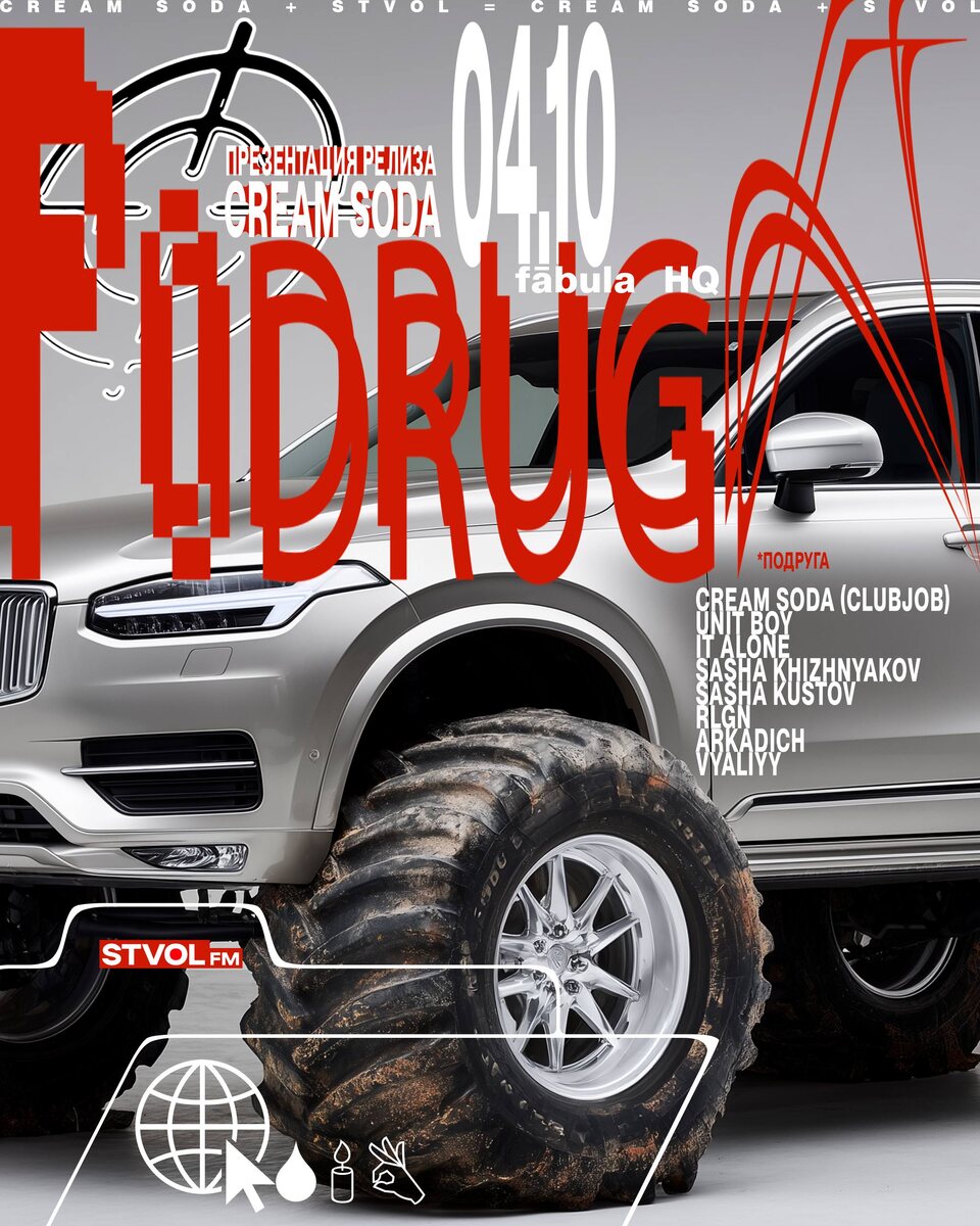 CREAM SODA X STVOL: “ПОДРУГА” RELEASE PARTY 3 октября CREAM SODA выпустят Подругу в свет. 4 октября CREAM SODA и СТВОЛ будут праздновать др Подруги ночью и громко. Вечеринка пройдет там же, где группа сняла клип на трек - Fābula Hq. (А что будет клип? Ого) К нам приедут друзья и подруги и другие и все там будут. Приходи и ты с подругой, это особое приглашение. Спасибо, ты молодец! • CREAM SODA (CLUBJOB) • UNIT BOY • IT ALONE • SASHA KHIZHNYAKOV • SASHA KUSTOV • RLGN • ARKADICH • VYALIYY • REPTILOID 🎫 Билеты FC/DC | 18+ 📆 4 октября, в 22:00 📍Fabula HQ, Москва, Самокатная ул. 4Б с2
