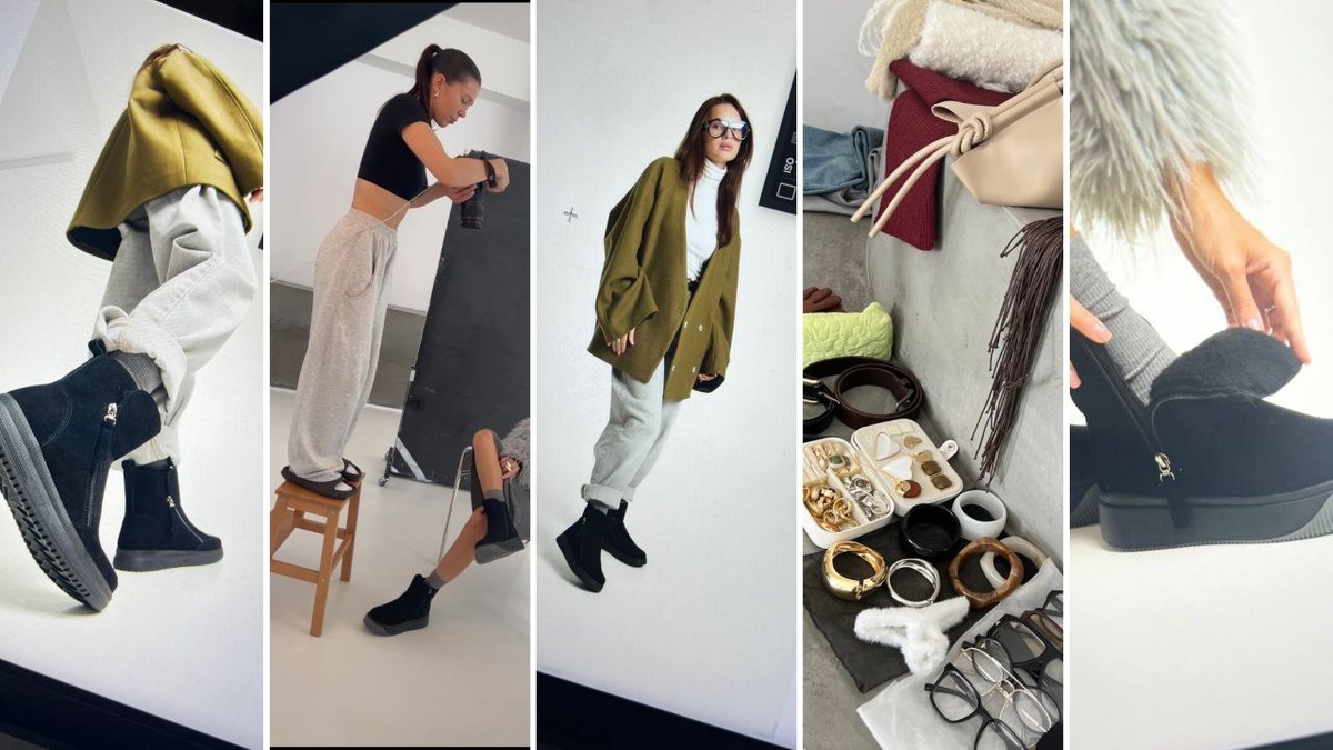 Когда смотришь на итоговые фото зимней обуви, кажется, что всё идеально: модель позирует так, будто родилась в ботинках, свет падает безупречно, одежда сидит ровно и стильно. Но правда в том, что за кадром всё было, кроме самой зимы. Мы честно хотели передать «зимний вайб» — и собрали для моделей образы: тёплые куртки, шарфы, варежки и шапки.