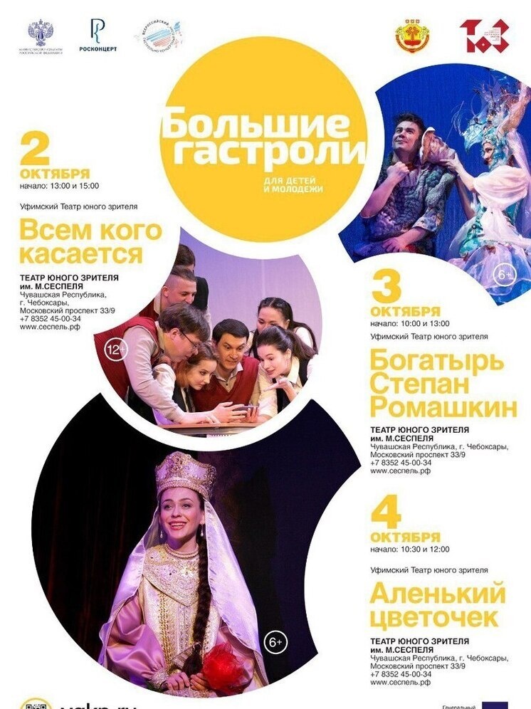 Театр юного зрителя города Уфа приедет в Чувашию в рамках Всероссийского гастрольно-концертного плана Министерства культуры РФ. В период с 2 по 4 октября на сцене чувашского театра юного зрителя имени М. Сеспеля состоятся выступления в рамках проекта поддержки детских и молодежных театров «Большие гастроли». Театр представит зрителям постановки, неизменно привлекающие внимание аудитории разных возрастов: • 2 октября в 13:00 и 15:00 состоится премьера спектакля-хроники школьной жизни «Всем кого касается» (12+). • 3 октября зрители смогут насладиться сказочной постановкой в два акта «Богатырь Степан Ромашкин» (6+) в утреннем сеансе в 10:00 и дневном в 13:00. • 4 октября, завершив серию выступлений, театр покажет знаменитую детскую пьесу «Аленький цветочек» (6+) дважды — в 10:30 и 12:00. Автор: Иван Петров