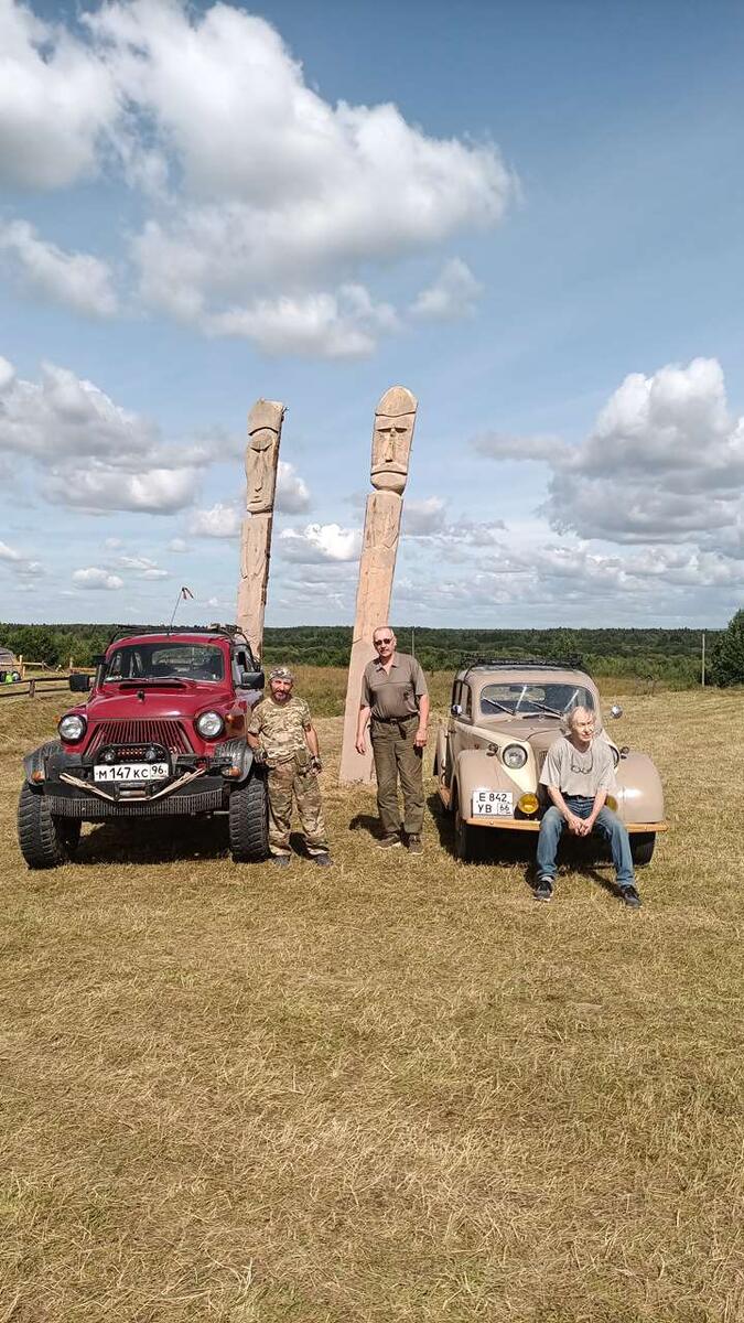 Наши машины редкие, заметные, постоянно приветствуют, а обгоняющие ещё и притормаживают и фотографируют: будь бдителен, чтобы не столкнуться. Где-то в районе Чердыни колонна из семи машин нас вообще остановила – давайте пообщаемся. Давайте, затем и едем. Пермяки, съезженная компания автотуристов, путешествуют часто и далеко. Автоманы. Ну как проскочить мимо таких раритетов? Фото снаружи, фас и профиль, а что под капотом, а панель приборов? А ходовая? Облазили, общупали, остались довольны. Ну и хорошо. Счастливого пути по ровной дороге.