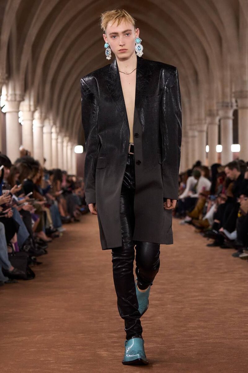 ACNE STUDIOS SS 2026 В новой коллекции Acne Studios весна-лето 2026 гармонично переплетаются мужское и женское, академическое и уличное, формальное и повседневное. Одежда выглядит слегка изношенной, с текстурами, которые придают ей "характер" и ощущение функциональности. Основные цвета — нейтральные (бежевый, серый, кремовый, выцветший джинс). Яркие акценты — турецкий бирюзовый и марун. Используются прозрачные ткани, кружева, потёртый деним, кожа и замша. Ключевые детали — разрезы, ажурные вставки. Много объёмных жакетов, напоминающих мужские блейзеры, и юбок с завышенной талией. Силуэты могут быть прямыми или слегка растянутыми. Особое внимание уделено акцентам: корсеты, пояса, разрезы и дыры подчёркивают фигуру. Обувь: ковбойские сапоги, рабочие ботинки, массивные модели. Украшения: крупные серьги. Стилизация слоёв: рубашки под прозрачными юбками, жакеты поверх кружев. Сочетание грубого и нежного.