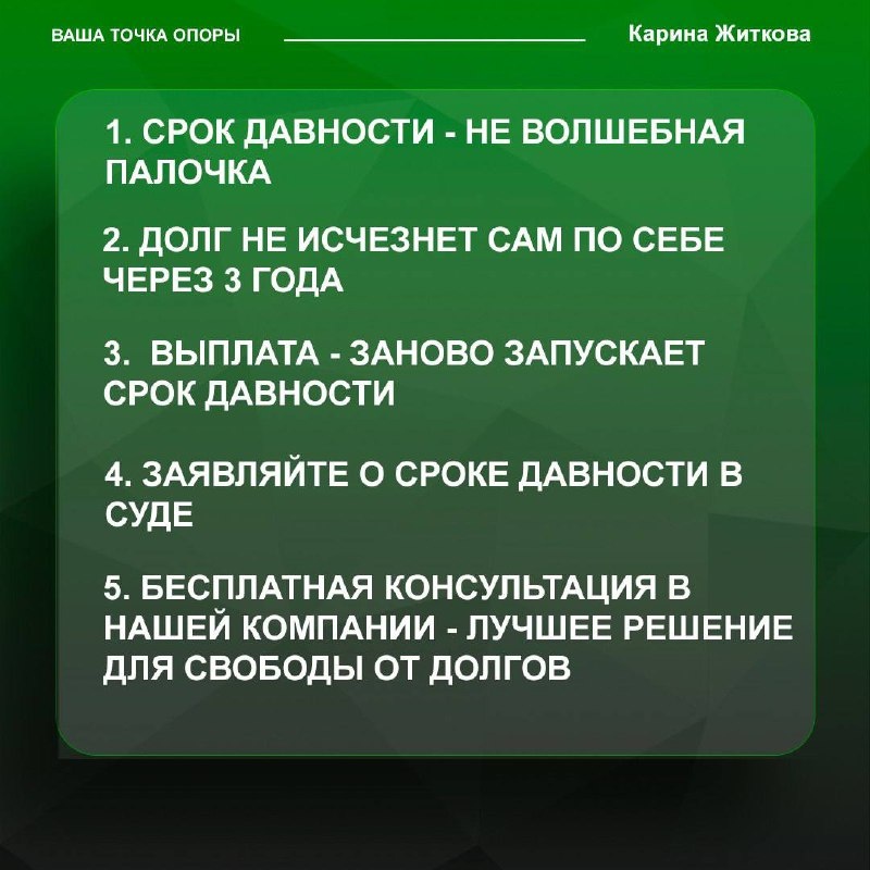Подожду три года, и долги испарятся сами собой! — именно так думают тысячи должников, попадая в опасную ловушку. Но правда может оказаться болезненной: срок исковой давности не волшебная палочка, которая автоматически освобождает от долгов. Давайте разберем жесткую реальность: даже спустя 3 года ваш долг никуда не исчезает. Коллекторы продолжат звонить, а кредиторы — присылать письма с требованиями. Более того, если вы вдруг совершите хоть одну выплату по просроченному долгу, срок исковой давности начнется заново! Но есть и хорошая новость: вы можете использовать срок давности в свою пользу. Главное — знать как! Срок исковой давности становится вашим щитом только когда вы активно заявляете о нем в суде. Без этого заявления суд будет рассматривать дело, как будто никаких трех лет не прошло. Мы понимаем, как страшно жить в постоянном стрессе из-за долгов. За 8 лет практики мы помогли более 1344 клиентам законно освободиться от долгового бремени. Хотите узнать, как законно и гара
