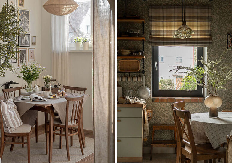 К тяжелым, массивным деревянным фасадам кухонного гарнитура подойдут легкие ткани, например хлопок или лен. Они добавят воздуха и визуально облегчат пространство.