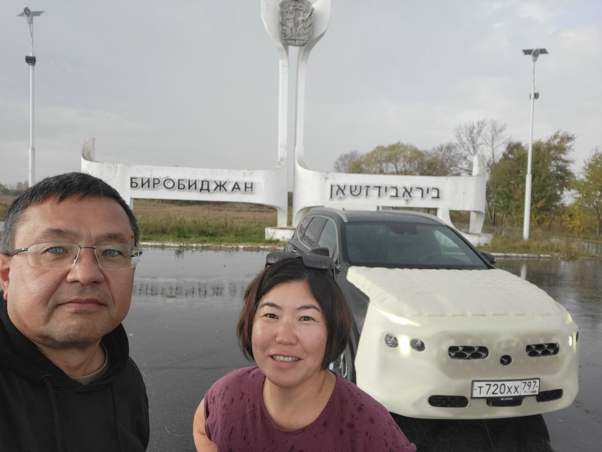 Биробиджан встретил нас грозой с проливным дождем, внезапно начавшимся ровно в тот момент, когда мы остановились возле стелы с названием города. Селфиться пришлось уже наскоро.