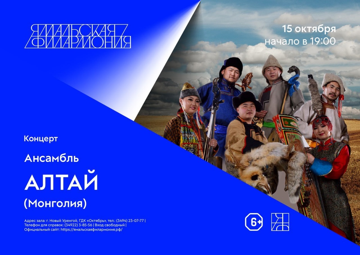 Уникальное музыкальное событие в Новом Уренгое! В честь 50-летия города, Ямальская филармония представляет: концерт всемирно известного ансамбля «Алтай» из Монголии! Погрузитесь в волшебный мир традиционной музыки и культуры! #Юбилей_для_людей #НУРу50лет 15 октября, 19:00 ГДК «Октябрь» Вход свободный! 📸 МАУК «ЦКС» ❤️ Импульс Севера | Подписаться в MAX
