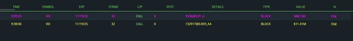 Кто-то только что поставил $12,5 млн на хаос На скане выше — свежая сделка: институционал купил 132 917 контрактов CALL на VIX со страйком 32 и экспирацией в ноябре 2025. Общий объём — $12,5 млн премии. Что это значит? Индекс волатильности (VIX) сейчас обычно живёт в районе 12–15. Чтобы страйк 32 стал «живым», рынки должны нырнуть в турбулентность: падение S&P на 20%+ и паника в воздухе. В прошлые разы такие уровни VIX были только во время серьёзных кризисов. Сценариев всего два: 1. Это может быть хедж — кто-то страхует многомиллиардный портфель от возможного обвала. 2. Либо это чистая ставка на хаос — спекуляция, что в ближайшие месяцы рынок тряхнет. Интересно, что ставка сделана долгосрочная — до конца 2025. Совпадает с тем, о чём мы с вами уже говорили в постах про возможную рецессию и «эру дорогих денег». Вопрос к вам, инвесторы: как думаете, это страховка или охота за x10 на кризисе? #рынки #опционы #волатильность #VIX