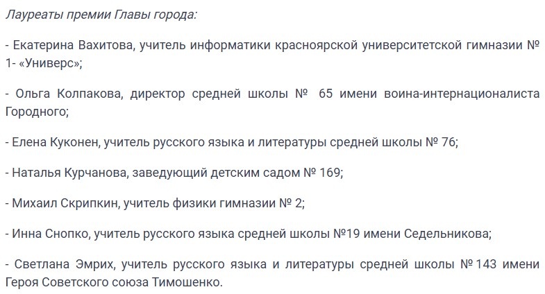 Премия главы города в области образования присуждается с 1999 года педагогам и руководителям муниципальных образовательных учреждений. В текущем году размер материального поощрения составляет 50 тысяч рублей. Премии удостоены семь красноярских педагогов.