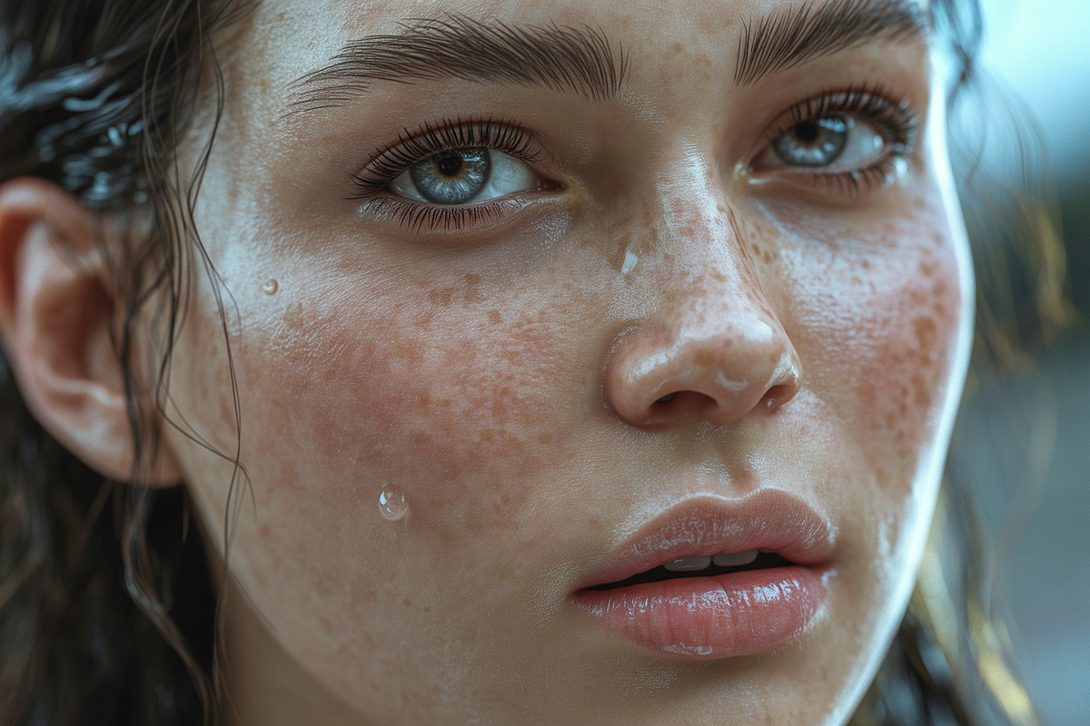 📸 "Гиперреалистичный модный портрет молодой женщины, крупный план лица, нежные веснушки, капельки воды на коже, высокодетализированная текстура кожи, демонстрирующая поры и тонкие линии, мягкое естественное освещение, сияющая и влажная кожа, глянцевые губы нежного естественного цвета, живые и ясные глаза, реалистичные ресницы и брови, легкий макияж, подчеркивающий естественную красоту, фотореалистичная визуализация, сверхдетализация, разрешение 8K, малая глубина резкости, мягкий фон боке, кинематографический стиль модной фотографии."