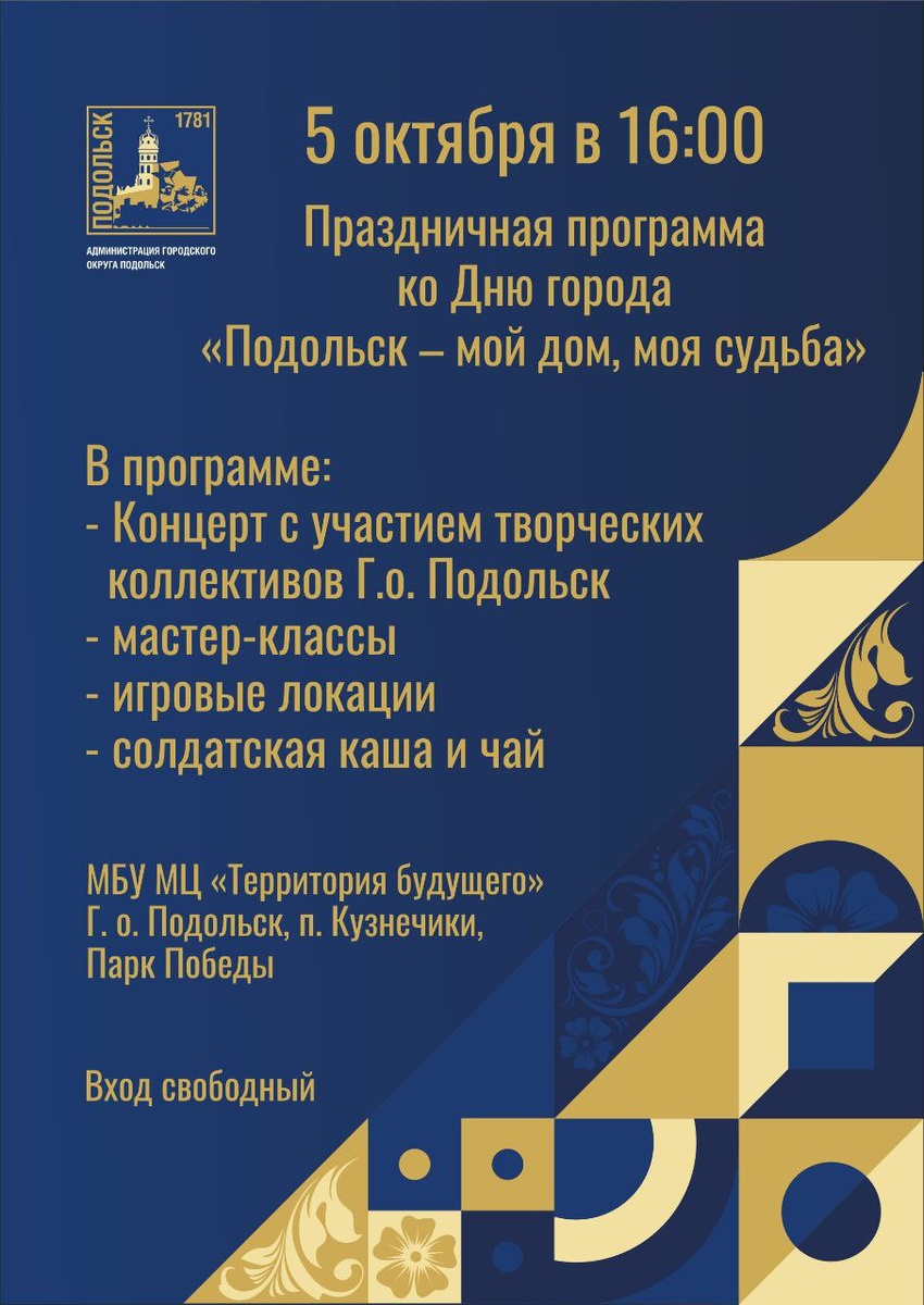 ✨ Праздничная программа в п. Кузнечики ▶️ Концерт ▶️Мастер-классы ▶️ Игровые локации ▶️ Солдатскач каша и чай ☕ 🚫 Возраст: 0+ 📆 05.10.2025 🕒 16:00 🏢 Молодёжный центр "Территория Будущего" 📍 г. Подольск, п. Кузнечики, 8а 💰 Вход свободный❗️ ⭐Поддержать канал голосом 💰 Вакансия - курьер в Подольске ✅ Мероприятия Подольск https://dzen.ru/id/66ed500f7b5671493eca3fd6 http://vk.com/podolsk_events http://dzen.ru/podolsk_events