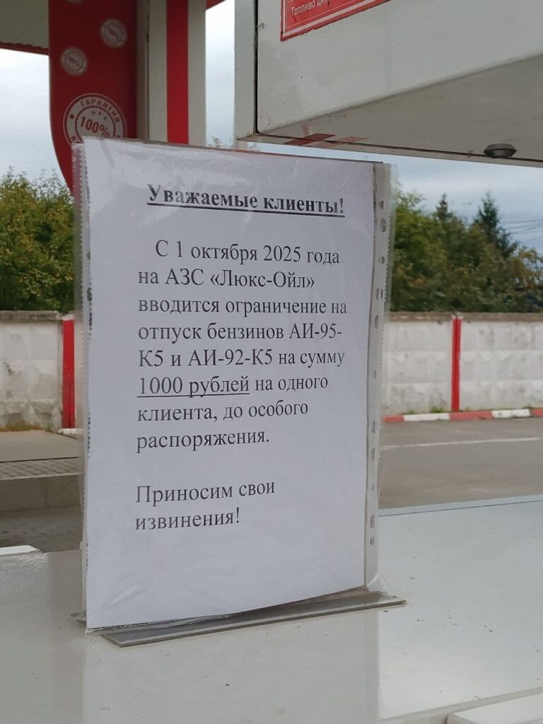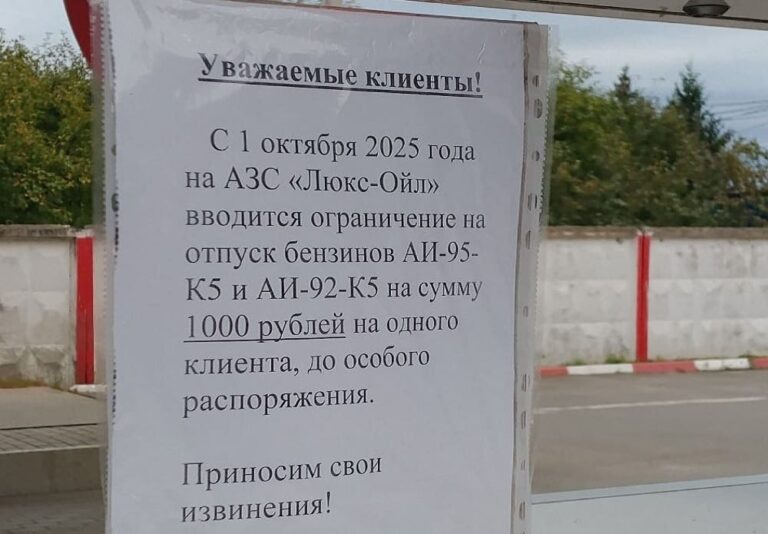 – С 1 октября 2025 года на АЗС “Люкс-Ойл” вводятся ограничения на отпуск бензинов… – говорится в объявлении на заправке сети на улице Почтовой в Бежицком районе Брянска. И дальше стоит “жирная” приписка, чтобы водители, видимо, не доставали однотипными вопросами. – До особого распоряжения!
