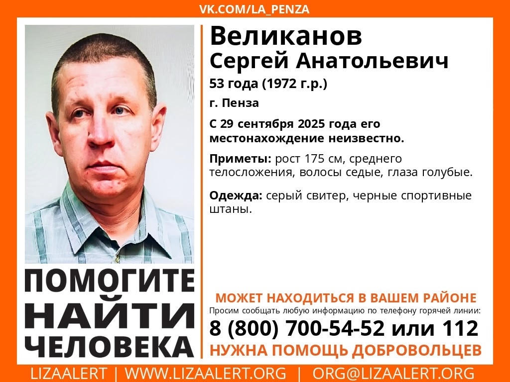 Волонтеры поискового отряда «Лиза Алерт» сообщили о поисках 53-летнего жителя Пензы Сергея Великанова. Мужчина пропал 29 сентября – с этого дня о его местонахождении ничего неизвестно. Ориентировка была опубликована 2 октября. В ней указано, что пензенец имеет следующие приметы: рост около 175 см, телосложение среднее, волосы седые, глаза голубые. В момент исчезновения он был одет в серый свитер и черные спортивные штаны. Волонтеры обращаются ко всем жителям региона с просьбой не оставаться равнодушными. Если вы располагаете какой-либо информацией, которая может помочь в розыске, сообщите об этом по горячей линии 8 800 700 54 52. Звонки принимаются круглосуточно и совершенно бесплатно.