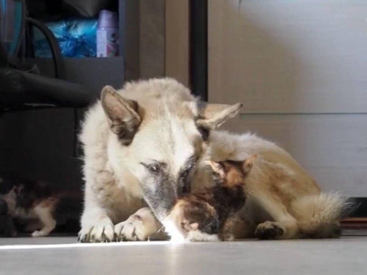 На кадрах, показанных в телепередаче, Ёжка ухаживает за котятами и играет с ними, да и малыши сами тянутся к собаке.