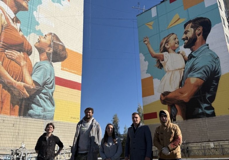 Яркий художественный мурал, посвященный любви, семье и детям, украсил фасады зданий в районе Правобережья.